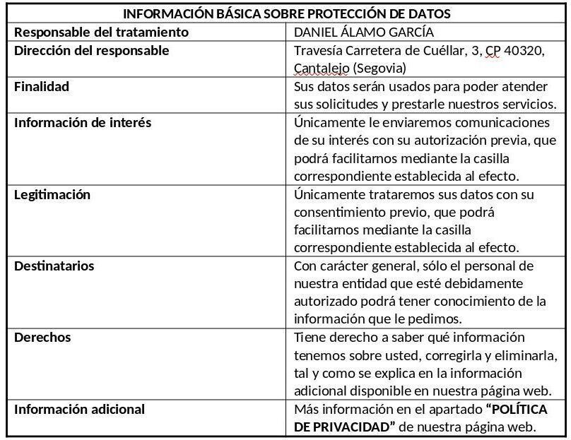 Para ejercer sus derechos deberá ponerse en contacto con el Responsable en la dirección Calle Pinarejo 49 2º, 12 B, 40320 Cantalejo (Segovia).